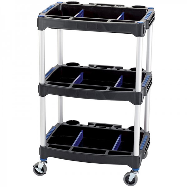 Plastic shelves with Aluminium uprights, comprising three shelves each with three compartments with removable dividers, six screwdriver holding slots, four additional compartments, two cup holders and a cable tidy. Two fixed and two lockable swivelling castor wheels. Supplied flat packed with instruction booklet. Carton packed.