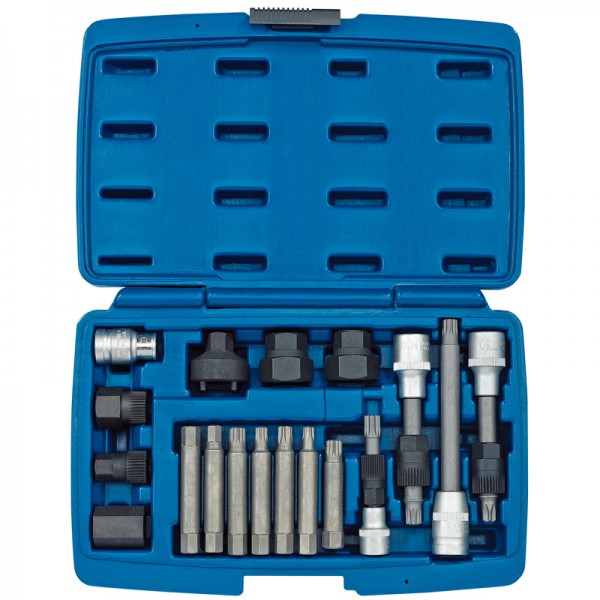 Expert Quality, for removing alternator freewheels. The comprehensive kit can be used on popular European car marques either on or off the engine. Packed in blow mould case with display sleeve.
