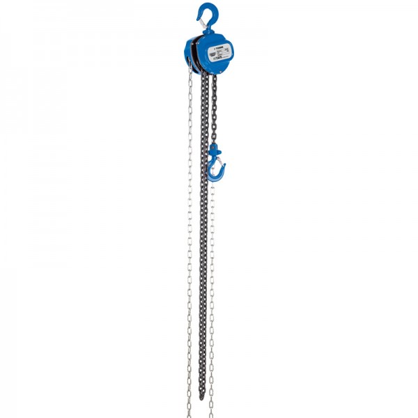 Expert Quality, ideal for the workshop or factory use. The chain hoist has a triple spur geared shaft and pinion with load braking and double pawls. The compact gear housing allows use in areas of limited clearance. High quality welded chain with safety latches on the load hooks.