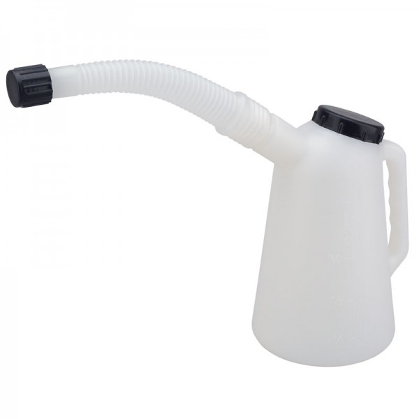 High density polyethylene. Resistant to diesel/petrol, oils and most acids. Flexible spout with carrying handle and screw top lid. Metric and US imperial graduations on jug body. Sold loose.