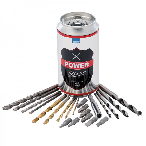 This special edition combination drill bit set includes a selection of popular sized drill bits suitable for drilling metal, masonry and wood. It also includes a 60mm magnetic bit holder and a range of screwdriver bits made from chrome vanadium steel. All supplied inside a special edition beer can making it an ideal gift set.