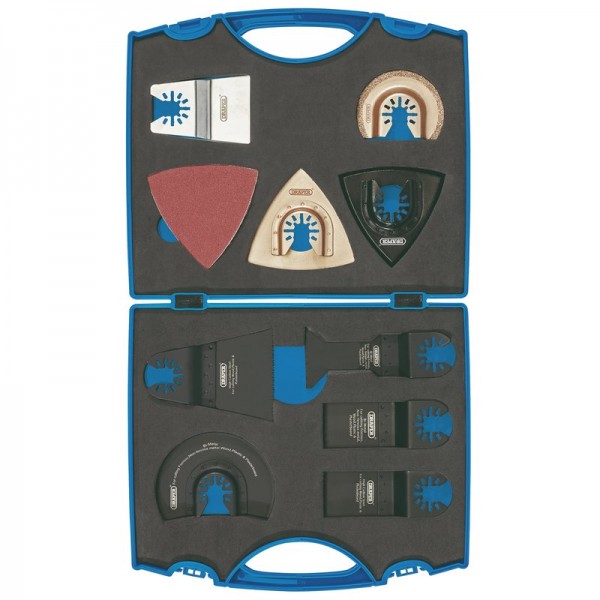20-piece set comprising of the most popular oscillating multi-tool blades. Designed for cutting ferrous and non-ferrous metal, wood, plastic and plasterboard. There is also a scraper and blades included for removing grout and mortar. The sanding sheets are suitable for a wide range of surfaces. Universal fitting for use with Draper and other manufacturers’ oscillating multi-tools.